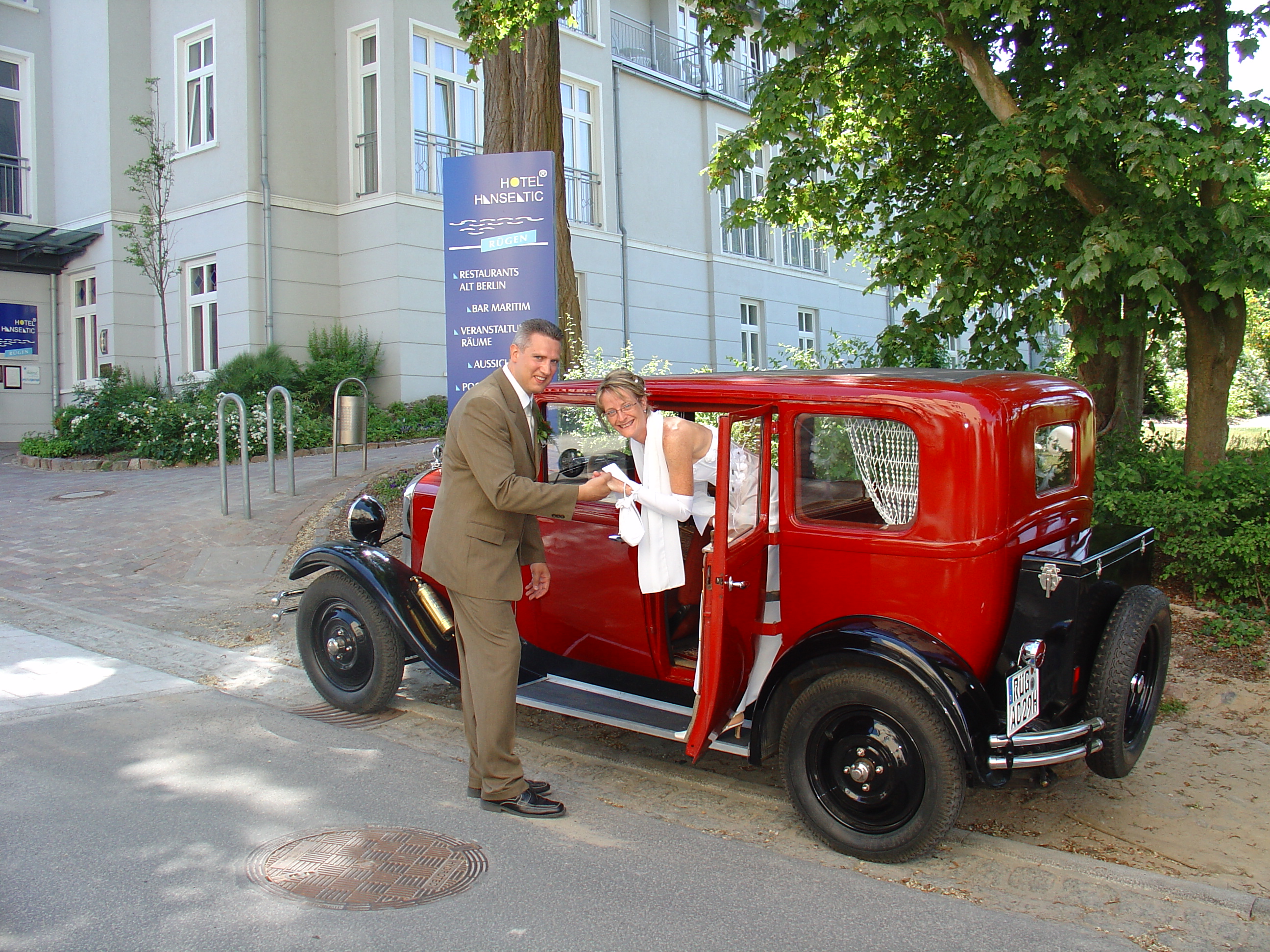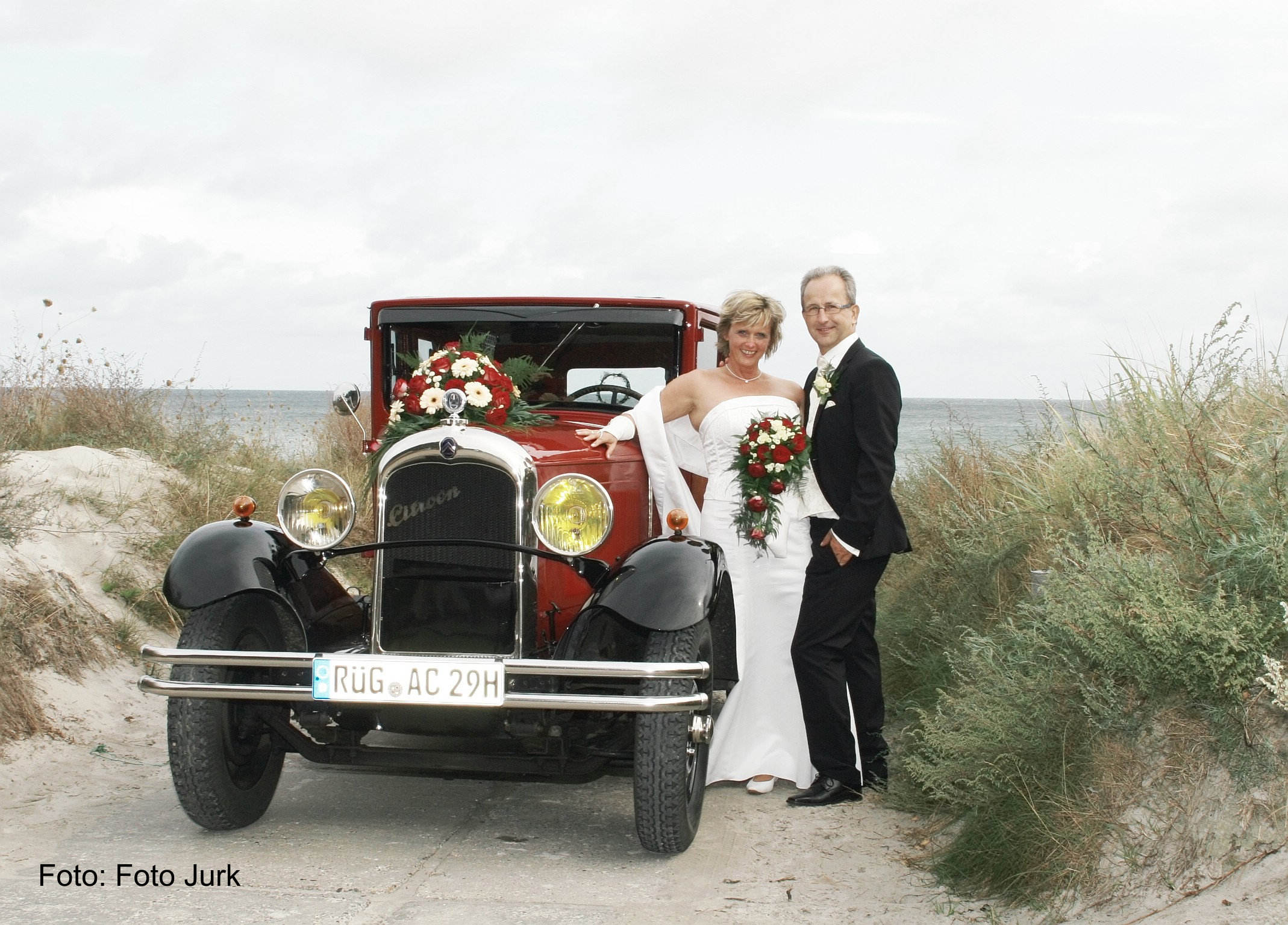 Das Ostseebad Göhren, idyllisch auf der Halbinsel Mönchgut gelegen, bietet verschiedene Möglichkeiten, um den Bund fürs Leben zu schließen. So können Sie zum Beispiel im Vju-Hotel heiraten. Hier finden Trauungen im Turmzimmer statt und somit befinden Sie sich während der Zeremonie auf dem höchsten Punkt des Ostseebades und haben einen wundervollen Blick über die Landschaft bis weit hinaus auf das blaue Meer. Oder Sie entscheiden sich für eine Strandhochzeit. Der feine weiße Sandstrand und das Rauschen des Meeres bilden dabei eine wohl einmalige Kulisse. Und – man mag es kaum glauben – Ihre Hochzeitsfahrt mit dem Oldtimer führt Sie dann direkt bis an den Strand. Denn für Hochzeitspaare dürfen unsere Fahrzeuge die Strandpromenade befahren.